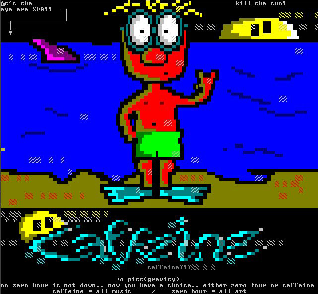 In the bbs underground, there were these art groups who made pictures and ads for different bbs's. I ended up getting into making these ansi pics. Okay, here's where my long story about ansi art groups start. At the time, the biggest group was ACiD, which was an acronym for "Ansi Creators in Demand" The small i was the cool thing to do. That meant you were 3LiT3 (elite). Anyway, I ended up joining a local group called 'CRiME'. That's when I started making all sorts of ansi art and stuff. The problem was, the group, crime, broke up about 3 weeks after I joined. So, I never released anything with that group. This was about the time too that I changed my handle to pitt. I never changed my handle again after that point.